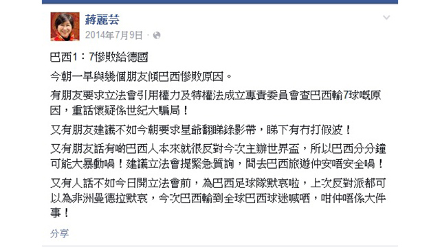 蔣元秋成日畀人抽水,但畀人抽得多佛都有火。所以上年世界盃巴西輸波嗰陣,即刻抽泛民成日拉布又要求默哀……不過抽到太劣,冇乜人識笑。學曾主席話齋:「我建議你考慮少啲講啲冇乜用嘅說話。」