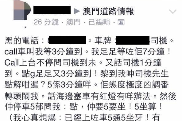 大家以為得香港多黐線佬?原來唔係!連澳門人都咁大壓力……Call的士,架的士只係遲咗4分鐘……就已經開Post發火。