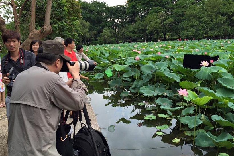 在龍友的前面,其實有位阿嬸,而阿嬸就拿緊一支勁長類似釣魚桿的東西,離勁遠咁吊塊黑布過去荷花處,為咩呀?就係為咗幫龍友做Background!「吊!吊!吊!」睇到呢度毛孩都只能如此感嘆。