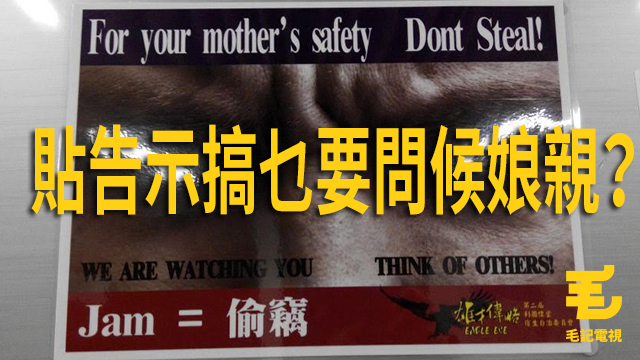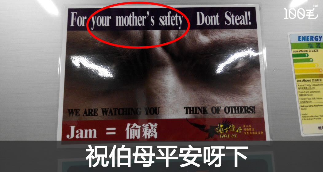 有人喺一間大學宿舍入面見到呢張告示,當堂嚇一嚇,咩事要搞到"for your mother's safety" (中譯:為你老母安全)咁嚴重呀?