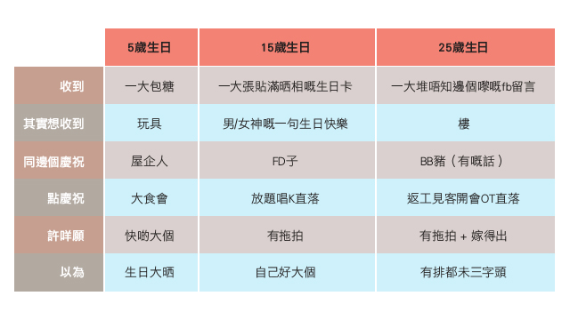 生日,話就話年年都有,好似冇咩特別,你嘴裡說不,反應卻很誠實。唔使唔認啦,你點都會有些少期待嘅。5歲同6歲差唔多,6歲同7歲又冇咩分別,但10年過去,你變咗幾多?