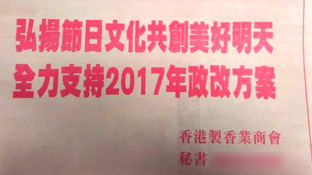 政改表決在即,香港製香業商會就係報紙登咗頁廣告,呼籲立法會,呀唔係,係立法局議員(乜香港仲有立法局?佢呼籲緊邊個?)支持政改方案,上面寫住「弘揚節日文化共創美好明天 全力支持2017年政改方案」。