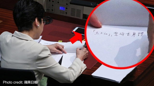 淋病司長今日下晝喺立法會審議政改方案期間,喺紙度寫上八字真言「太上心,要保重身體」,引嚟大家嘅猜測,到底佢呢句係同邊個講呢?