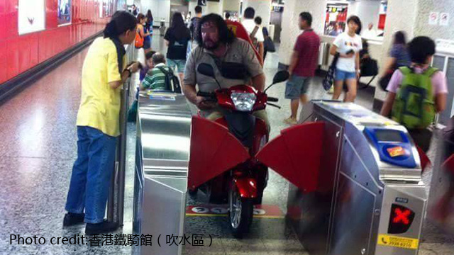 喺「香港鐵騎館(吹水區)」Facebook群組post咗一張相,有人揸住架紅色嘅「電單車」停咗喺地鐵嘅入閘位。