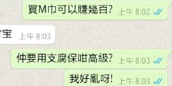 一位讀者神早流流收到一個發達秘笈,叫佢即刻落樓買M巾,仲話一張轉手賺四百蚊仲可以對分呀!