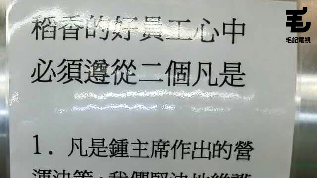 稻香集團不嬲都出名愛國,連對員工嘅思想指導都係遵從毛主席嘅教誨,真係好值得各位愛國愛黨嘅同志學習。 所以話文革式領導就是好領導,學足晒《人民日報》文革嗰時寫嘅「凡是毛主席作出的決策,我們都堅決維護;凡是毛主席的指示,我們都始終不渝地遵循。」如果間間公司都有咁清晰嘅員工指引,同埋咁偉大嘅領導,咁啲打工仔就唔需要惴測腦細個腦諗緊乜,腦細叫你行東你唔好走西咁就得喇,easy~