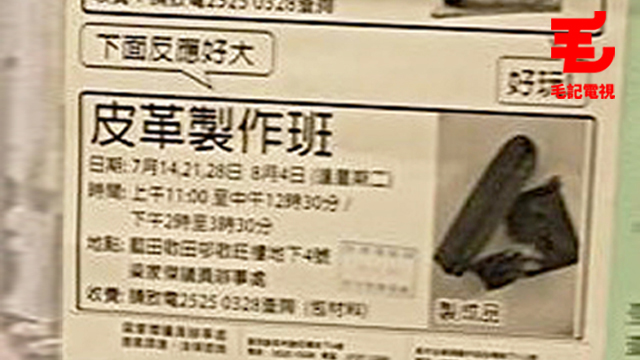 有讀者見到呢張相當吸睛嘅興趣班海報,唔好以為只係普通師奶細路興趣班,入面個皮革製作班話會「下面反應很大」㗎,仲要配埋張長條型工具圖片,到底你係教整乜嘢皮革工具呀? 當街當巷貼埋呢啲「興趣班」,你啲福利咁興奮,怕唔怕啲師奶頂唔順呀?
