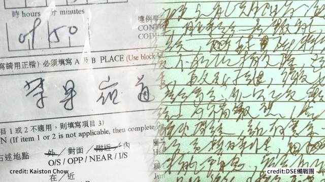 你哋有冇人估到呢位師兄到底寫緊咩?睇真啲,再睇真啲先啦! 經過一班高質網民嘅筆跡鑑證,佢哋估計呢位師兄係想寫「茶果嶺道」,等我仲喺度諗「禁果X道」即係邊度……其實呢位阿SIR會唔會就係幾年前DSE後被匿名表揚字體嗰位同學,長大咗就成為交通警,繼續透過周圍抄牌發揚中國書法嘅狂草字體? 毛毛一睇再睇,始終覺得呢張考卷先係真正嘅師傅級中嘅師傅級,你哋有冇人認到是但一粒字寫乜?