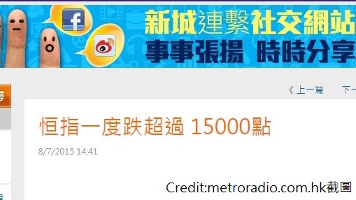 咩話?暴跌萬五點?!等等,唔好跳住呀喂!!!!!!佢寫多咗個零咋! 睇新城個大標題寫住「恒指一度跌超過15000點」,不過再睇下內文,原來係「受內地股市急跌拖累, 港股爆發小型股災 , 恒生指數午市跌幅擴大 , 一度跌超過 1500點 」哦…..原來係千五點啫,係唔係即係覺得其實都唔係跌咗好多?新城應該係想幫大家調整下心情啫,唔使咁驚。不過千祈唔好真係畀佢開口中,如果唔係IFC樓下又多幾廿百條無辜嘅生命㗎喇!