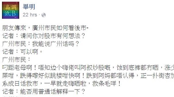 呢位呀叔用廣東話答:「叼距老母啊!唔知邊個嗨佬叫阿叔炒股嘅,蝕到底褲都冇曬,漲少少就好似屙屎咁,跌得嚟好似跳樓咁快啊!跌到阿媽都唔認得,正一撲街杏加橙!如果唔系成日話救市,一早就走嗨曬啦,救條毛咩!」 用普通話解釋就係「相信黨,相信國家,股市穩健,加油!」
