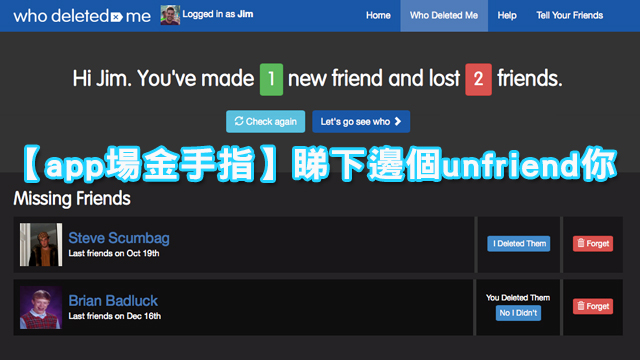 你以為網絡世畀,like就係一切咩?仲有friend子數目呢? 無啦啦發現少咁一兩個friend子,點先check到係邊個呢?Twitter有 Who Unfollowed Me ,Instagram 又有Friend or Follow,facebook而家都有Who Deleted Me啦!