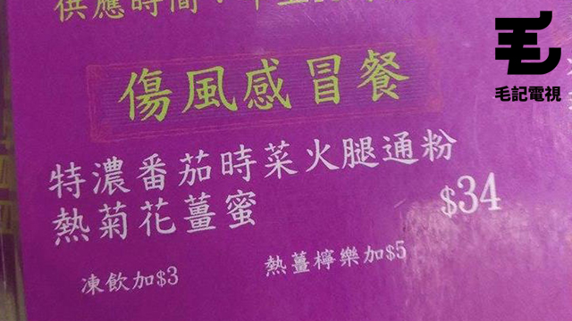 呢位貼心嘅老闆顧及到一眾冇人冇物嘅毒L如果唔好彩病咗,又冇阿媽煲粥,又冇女朋友買白面包,一個人發住冷咁喺屋企淥杯面嘅淒涼情景,於是就發明咗呢個專畀病丁食嘅傷風感冒餐喇(好似係)。 你睇下,其實呢個世界仲有茶記係關心你㗎,各位毒L係唔係即刻覺得人間有愛呀,毛毛都好滾動呀!