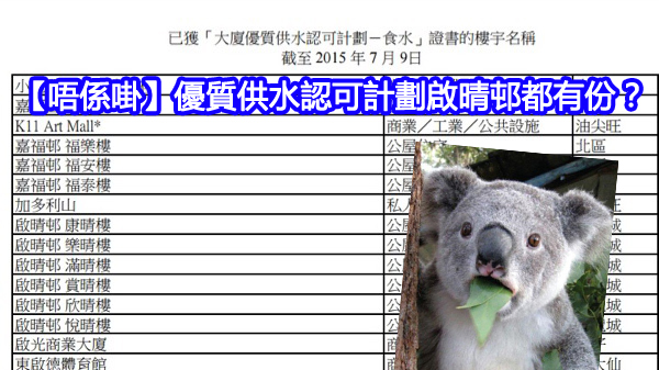 呢份上個星期先出爐嘅「大廈優質供水認可計劃」,入面竟然連食水有鉛毒嘅啟晴邨都有份。啲水有毒都過到優質認可,咁即係唔識字去考DSE都會攞A㗎啦,咁你叫你呀媽唔好再問你DSE點解考成咁啦,因為世事嘅嘢係冇得解㗎。