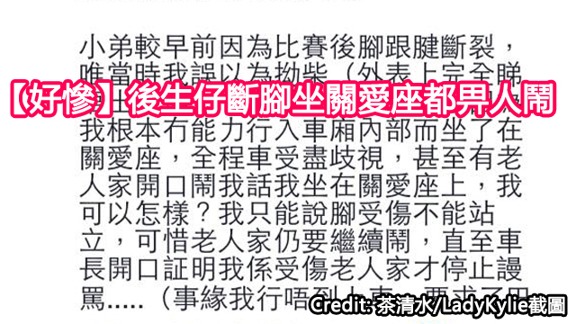 又係關愛座惹的禍。有個後生仔後腳跟踺斷裂(哇聽到都痛),傷到企都企唔到於是忍辱負重咁坐關愛座,喺巴士上面利申晒傷勢都繼續畀個老人家鬧呀!