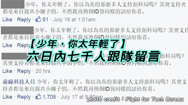 差唔多7000個comment,每個都係寫住「少年,你太年輕了。你以為真的那麼多人支持創科局嗎?其實支持者都是來自親共小圈子的,不然我再換個ID發同樣的話給你看。」