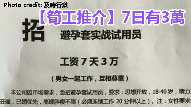 前排畢咗業仲未搵到工,又或者啱啱抄咗腦細魷魚?呢份試用員嘅工作就可能啱你心水,呢份工嘅要求好簡單,男嘅就只需要可以連續工作20分鐘(不過已婚優先),女嘅就要思想夠開放,有性興趣嘅朋友就不妨試吓啦。