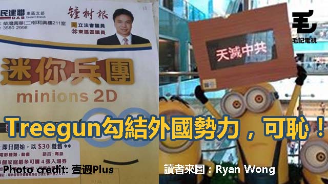 外國勢力明張目膽咁入侵香港,實在係唔能夠接受呀!不過,Treegun公然帶頭作反,就更加唔能夠接受呀!禮義廉一向以樂善好施、慷慨解囊見稱,成日都請街坊食蛇齋餅糉,所以間唔時有好嘢益街坊都唔出奇,但Treegun早前竟然請街坊睇Minions(其實都唔係請,要自己畀30蚊入場嘅),毛毛都覺得奇㗎喇,無啦啦轉睇戲?