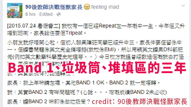 事緣有間Band 1嘅學校有個學生嚟緊嘅學年又要Repeat中一,即係準備第三年讀中一,佢嘅老師就打電話畀個家長問吓佢有冇諗過同個學生轉校,個家長除咗用標準答案去話呢啲全部都係學校嘅責任,教極都教唔好個仔之外,佢仲發表咗嗰驚人嘅偉論,就係同香港嘅學校分咗類。