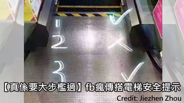 facebook有二萬幾個人些牙咗呢個安全提示,呢位網民就話,電梯下面第一同第三格係安全位,第二格下面就係絞肉機,一定要大步檻過咁話呀。