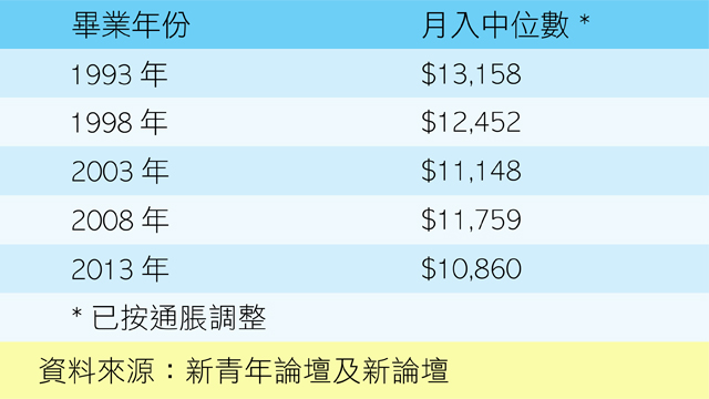 最近有研究發現,香港大學畢業生嘅薪金中位數喺過去廿年持續插水。按通脹調整之後,2013年嘅大學畢業生起薪中位數比1993年低2千幾蚊!