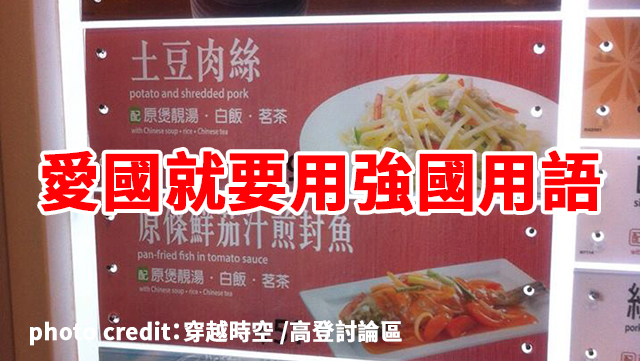 巴打「穿越時空 」喺高登討論區開咗個post話見到餐牌有味菜叫「土豆肉絲」,而唔係用香港叫法「薯仔」,大感不滿。係囉,明明叫開「薯仔」㗎嘛,典解無啦啦要改做「土豆」嘅?如果香港再愛國啲,所有食物都跟晒強國叫法,又會點呢?
