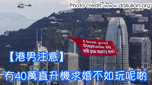 再唔係,吊banner吊戒指呢啲都太普通喇!好似呢位巴打咁,直情用吊雞車吊自己上天(橋),你睇老婆幾冧豬,仲平過租直升機吊條布幾廿倍?~