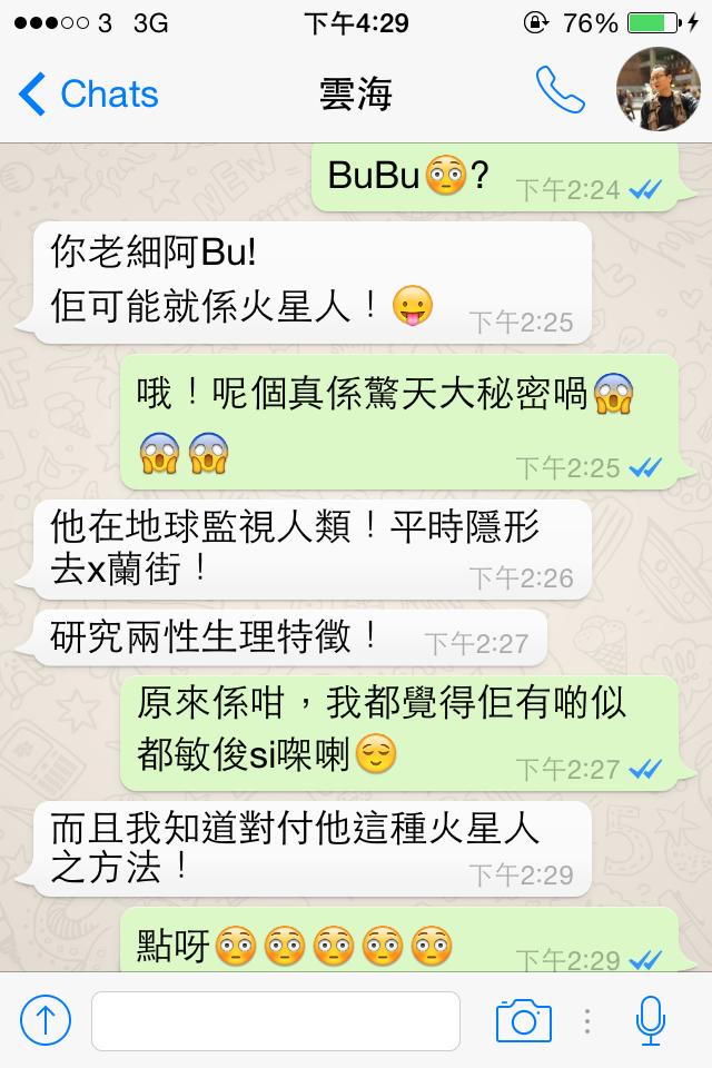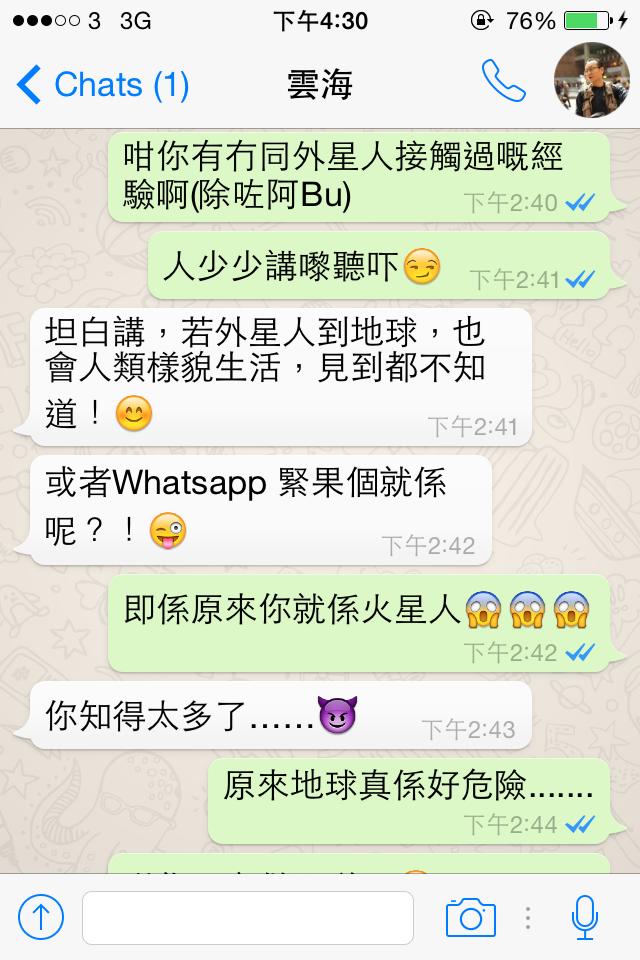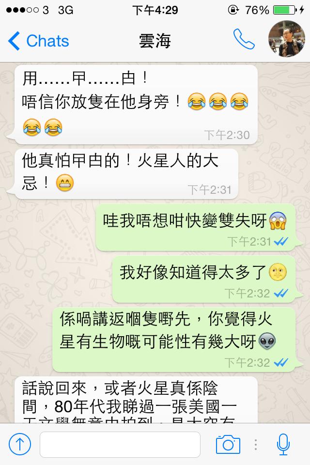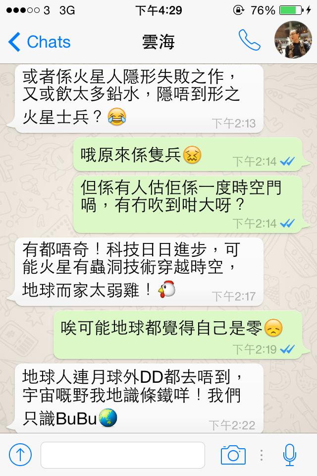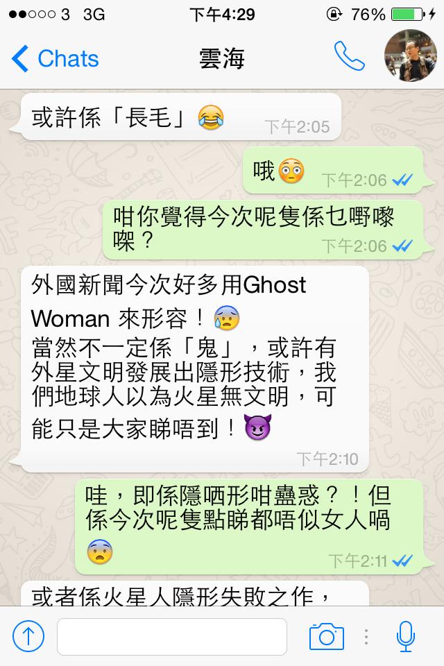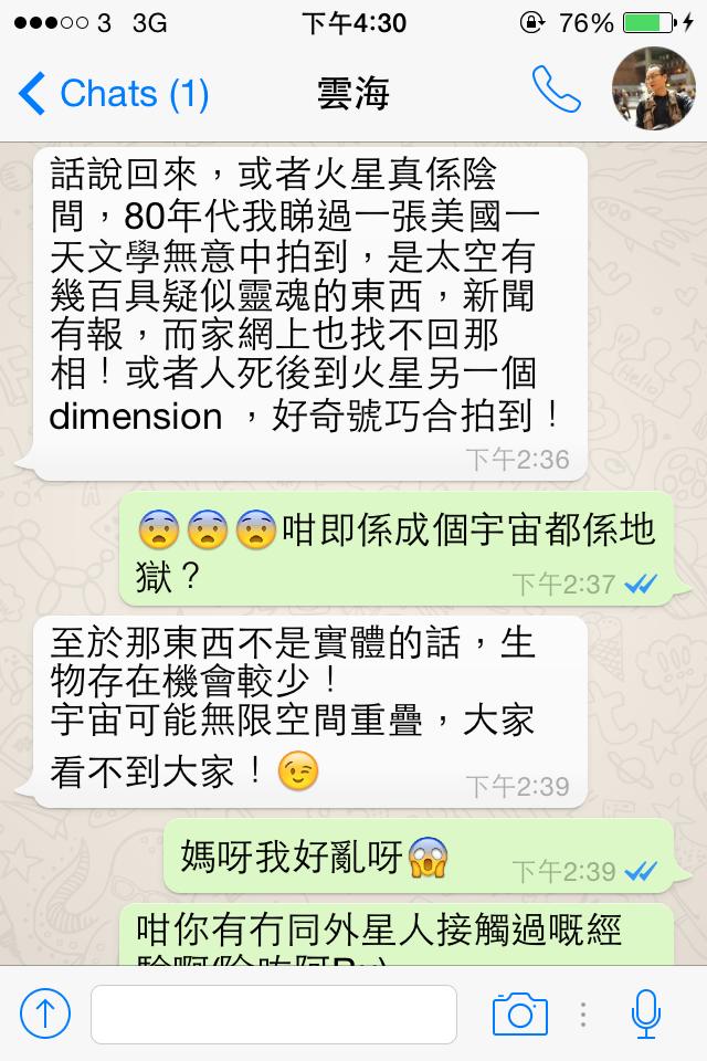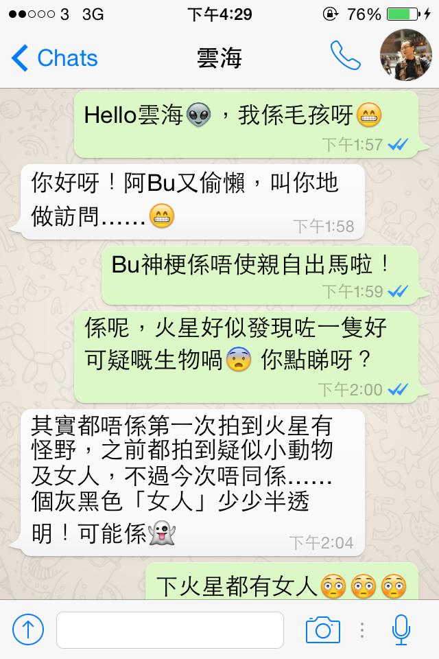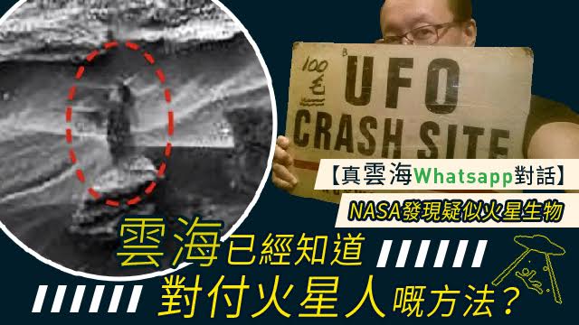 早前NASA公佈影到火星有疑似生物呀,隻嘢成個半透明人型咁喎,到底係咩嚟㗎!?毛毛就特登搵咗雲海同大家專業咁分析下。 呢張相係美國太空總署(NASA)火星探測車好奇號今年六月喺火星影㗎。影到一隻人型物體呀喂,仲唔火星人? 呢個毛文,梗係要搵專家啦! 唔該晒你呀雲海,未儲夠錢買太空船飛,下次都係喺時空咖啡館見先啦。 去探雲海:時空咖啡館
