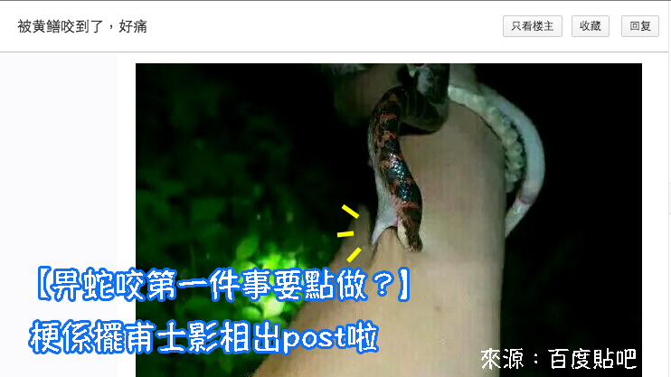 今日有位強國網民開post話自己畀蛇咬,仲影埋相,不過佢唔係post傷口照,而係仲畀條蛇咬住嘅相呀!唔知佢有冇同條蛇講:唔好放口住呀我未較好角度呀喂! 所以強國國人全部都武功高強,一隻手畀蛇咬住都無損霸氣,仲有另一隻手可以影相㗎嘛! 仲有其他神勇自拍(睇返:唔係唔影呀嘛?!),遲啲急救手册都可能會寫:如遇緊急事故,自拍開post後可按以下程序處理..... 來源:百度貼吧