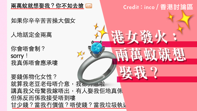 有網民話接受唔到自己男朋友畀兩萬定金就想娶佢,咪住先,定金?訂金定禮金呀?仲話好難想像女人咩都唔要就嫁畀男人,畀咁少錢即係當佢冇價值,當佢係垃圾喎......毛毛隔住個Mon都感受到呢位港女(?)真係好嬲!