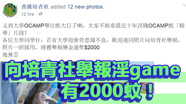 培青社喺facebook出咗個post,話歡迎同學仔send相向佢哋舉報淫game,張相登咗嘅話,仲可以有成2000蚊金手指費㗎,影多幾張,咪連Ocamp錢都賺返?