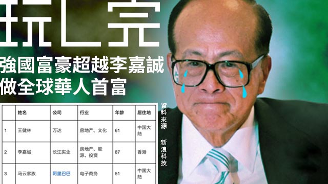 今日啱啱出咗《2015瀚亞資本·胡潤全球華人富豪榜》,最L有錢嗰個竟然唔係誠哥,而係強國萬達集團嘅董事長王健林?冇喇冇喇,誠哥嘅地位不保喇,誠哥做咗二十年全球華人首富,第一次畀人超越,仲要係畀強國嘅有錢佬超越?......