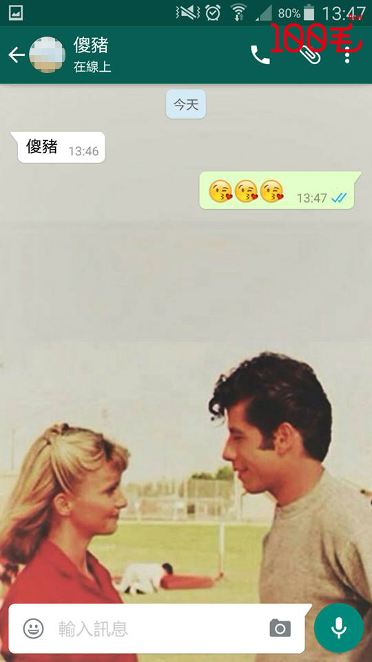 毛毛個有些少八卦嘅FD子可能悶啦,於是就昅下呢位哥仔手機玩緊乜。哥仔玩玩下facebook,突然有個叫傻豬嘅人whatsapp佢喎,而佢就覆咗3個啜啜咀emoji。睇到呢度,毛毛真係好葡萄囉,都係隔開一陣啫,使唔使咁痴纏呀!唔准呀隔空傳情呀!唔准啜啜呀!