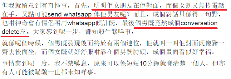點知,毛毛FD子再望多眼,就發現個女朋友豬當時根本冇用緊電話㗎!個哥仔仲即刻將成個對話delete咗!而女朋友就傻傻的調位去挨住男朋友膊頭…… 到底車上嘅女朋友,幾時先會知事實有幾殘酷呢?點解哥仔又要瞞住佢女朋友啜阿傻豬呢?其實,會唔會傻豬先係正室呢…… 到底,呢個世界,仲有幾多嘢係我哋掌握得到,毛毛應該用一程電車嘅時間,都望唔透……