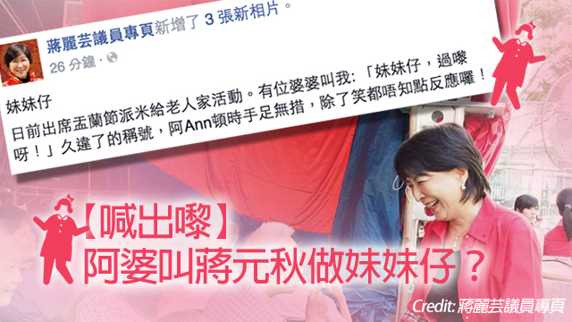 蔣元秋啱啱係Facebook話之前出席盂蘭節派米活動嘅時候,有位婆婆對住佢話:「妹妹仔,過嚟呀!」,仲話呢個久違了嘅稱號搞到佢除咗笑之外都唔知點反應!