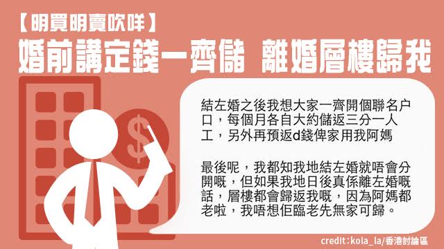 成交價方面,就係婚禮費用各五成,仲有層樓同阿媽一齊住,按阿媽要求兩年內生到bb,婚後一齊儲錢留錢畀阿媽,最後就算離婚層樓都要畀阿媽住呢幾項嘅。