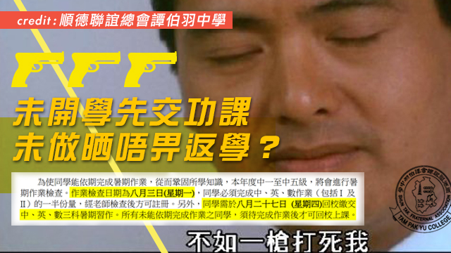 屯門有間中學出咗一張令學生睇完即灰鳩嘅通告,講明開學一個月前就要Check學生嘅功課進度,要求學生喺8月3號前最少要做完一半,唔單止,仲要學生喺8月27號(即係今日囉)親身返學校交功課,同學,你哋今日交咗未呀?