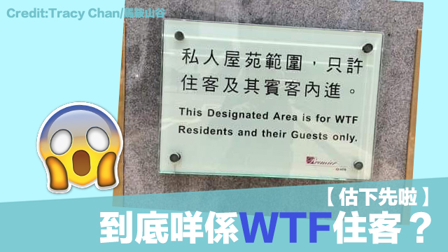 今日有網民見到一個霸氣告示,話呢個地頭淨係得一班叫WTF residents嘅住客同佢哋啲guest先入得咋㗎咋!叫WTF咁寸?WTF! 嗱你哋唔好滿腦子都係粗言穢語先得㗎,人哋個WTF唔係你講開嗰啲WTF嚟㗎! 原來WTF即係WaTerFront咁解呀~~ 毛毛表示,我都好想住喺WTF呀WTF!