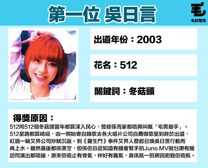 是咁的,本來吳日言有機會實現網民嘅集體回憶,上返Juno個《雷克雅未克》mv度,可惜工作人員一句「你嚟就嚟,唔嚟就唔嚟,橫掂冇咗你,MV都照拍㗎啦。」就令到召喚吳日言行動失敗。唓,唔紅啫,使唔使咁呀?《羅生門》事件之後,512話「我知自己不夠紅,知名度又不高,不過,就算是臨時演員都是演員,應該受到尊重。雖然我什麼也沒有,但我都可以選擇自已的路!」其實一年幾十個新人出道,真係紅到又有幾多個,不過至少佢哋揀咗嘅呢條路,唔止令自己嘅人生曾經發光發亮,仲照亮過好多人嘅青春。就算唔紅又點啫?呢個毛文,毛毛就想頒獎畀呢十位我最喜愛的唔紅歌手,可能佢哋而家已經音訊全無,唯有隔空頒個獎畀佢哋。