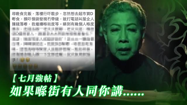 阿媽教落,七月流流真係唔好亂同街邊嘅陌生「人」講嘢,如果唔係,好似出事㗎嘛…... 農曆七月成條街都好似陰陽路咁紙錢橫飛,行過都沾寒沾凍,如果有仲有人同你講埋啲咁嘅嘢,毛毛一定驚到成晚訓唔著。 想像下所有人走晒,得返樓主一個企喺條街望住啲畀晒佢嘅紙錢嗰種哭笑不得嘅心情都幾複雜。不過,呢幾個阿婆仲慘公,返屋企搵椂柚葉沖廿次涼都未定到驚呀。 來源:Larry Lau截圖