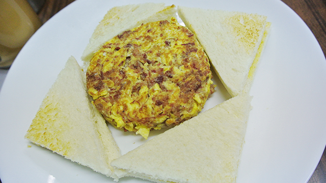 一上菜就畀佢個樣嚇親,四塊多士擺晒陣咁,中間嗰塊鹹牛肉蛋餅仲厚過毛毛塊面皮。