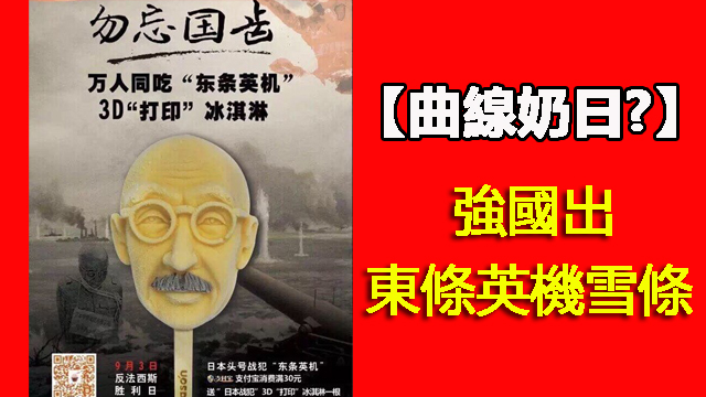今年係抗戰勝利七十週年,偉大嘅黨話晒都係中國人民抗日戰爭嘅中流砥柱嘛,除咗加強網絡限制同強勢閱兵之外,日常生活方面,都好應該時該記住戰爭嘅痛苦。強國就有間雪糕公司推出東條英機樣嘅雪條,等同胞們喺消暑嘅同時,都可以勿忘國齒喇。