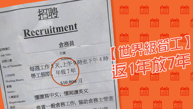 踏破鐵鞋盧覓雪,終於畀毛毛搵到份世界級筍工喇,年假有成7年咁多,只要喺度返夠1年,跟住就用嗰7年嘆下世界。Between,每個月人工得1萬蚊,即係1年得12萬,即係8年得12萬使咋⋯⋯窮住嘆世界啦唯有。