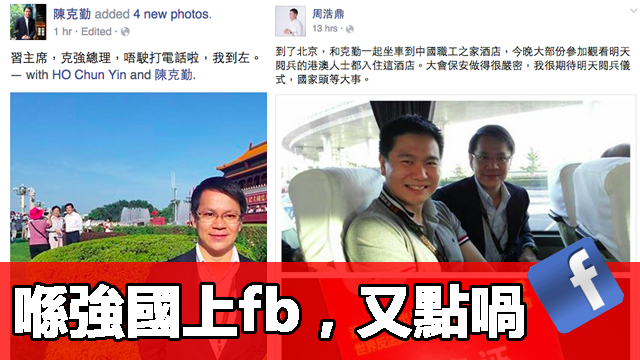 禮義廉副主席噚晚已經急不及待要同大家分享佢能夠分享國家抗戰勝利嘅喜悅,將佢同阿克勤一齊上京嘅相上載咗喺facebook,仲話保安做得好嚴密。咦?等等,之前唔係話網絡限制會升級,唔畀翻牆㗎咩?