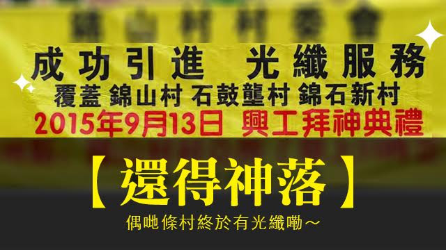 今雲真係還得神落嘞,天靈靈地靈靈,祖先庇佑神明關照,今次偶哋條村終於有光纖嘞,各位鄉紳父老孝子賢孫記得準時嚟祠堂拜神再打咭放上面書呀! 經過條村多年來一代一代咁努力建設,今日子子孫孫終於有光纖用喇! 單憑呢張光纖現曙光傳單,就知到村民係有幾咁期待,幾咁熱切!終於成功引入,一定要好好拜神呀! 唔知到時佢哋會唔會用返支光纖裝香,孝敬下神明呢?