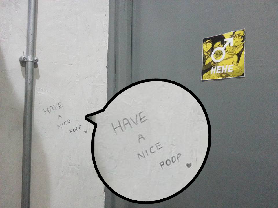 而家就連毛記電視城廁所幅牆都變埋留言板,毛毛啱啱小完個便都發現牆上寫咗句好Sweet嘅留言:「Have a nice poop」~
