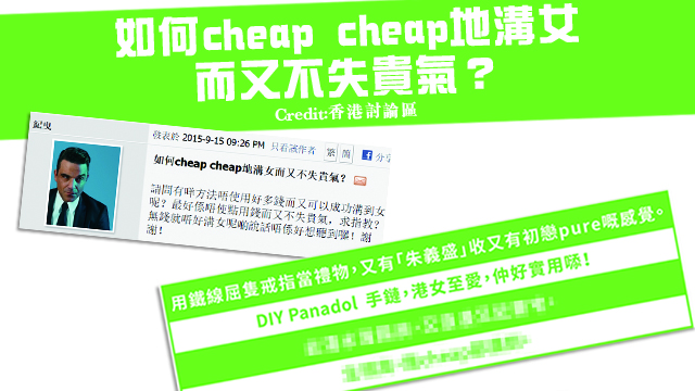 有位網友就喺討論區集思廣益,問大家點樣可以cheap cheap地溝女而又不失貴氣,毛毛經驗唔多,不過都聽啲窮L朋友(唔係我)講過嘅,就開心些牙下啦!