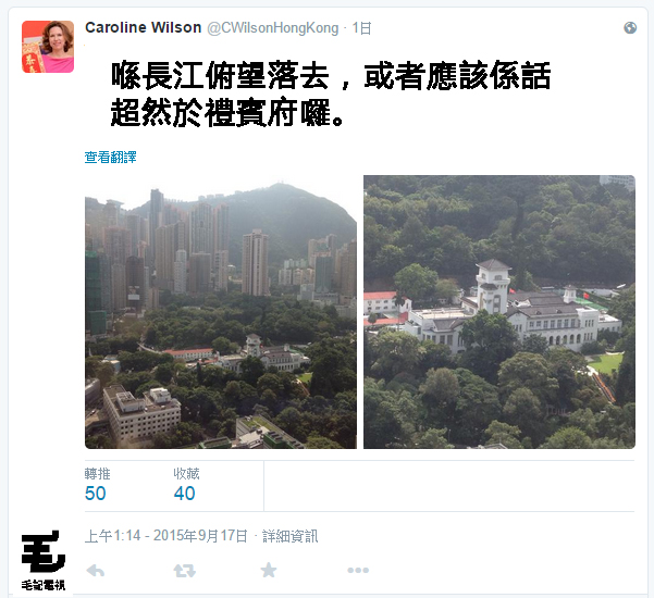 吳若蘭喺twitter up咗張由長江中心影出去香港禮賓府嘅相,仲話長江transcending禮賓府?喎!毛毛都知你哋唔識英文㗎喇,等我用MoMo translate變返做中文啦!