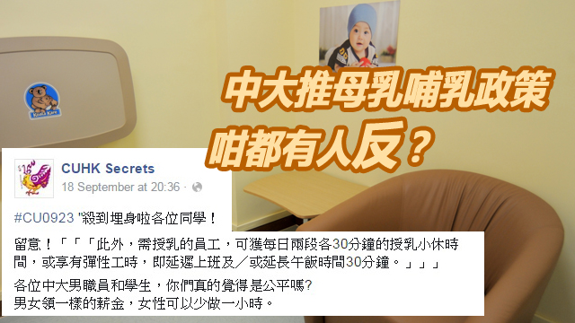 不過,對於呢個新政,有疑似男性嘅網民就覺得相當唔公平嘞!佢表示有乜理由男女人工一樣,但係(要餵母乳嘅)女性打工仔就可以做少一個鐘頭嘢?而且,呢位網友嘅推理能力非常之強,佢能夠見微知著、以小見大,從中大呢個政策就可以推想到香港以後嘅打工仔生態,以及男女地位不平等嘅嚴重民生問題,真係好有遠見囉。