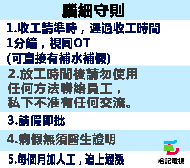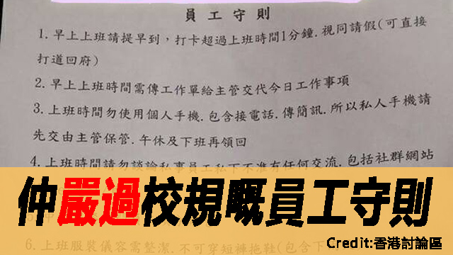呢份指引係由一個叫「股巿神算」嘅網民post嘅,份指引寫到明,遲1分鐘唔叫遲到,而係直情叫缺席呀!喂,其實我真係好欣賞呢個腦細可以咁清晰具體咁寫明晒啲規矩,遲就係遲,遲1分鐘都係遲,no excuse!守時本嚟就係美德,係班鍾意偷懶嘅廢青破壞晒啲規矩啫,我撐你呀腦細,不過如果我公司有呢條例,咁應該日日都冇人返工。仲有,手機要交出嚟,放工先拎得返,唔講仲以為係中學校規。不過腦細都係怕你掛住打機丁女,專唔到心做嘢,搞到要OT先出此下策啫(應該係),真係用心良苦!