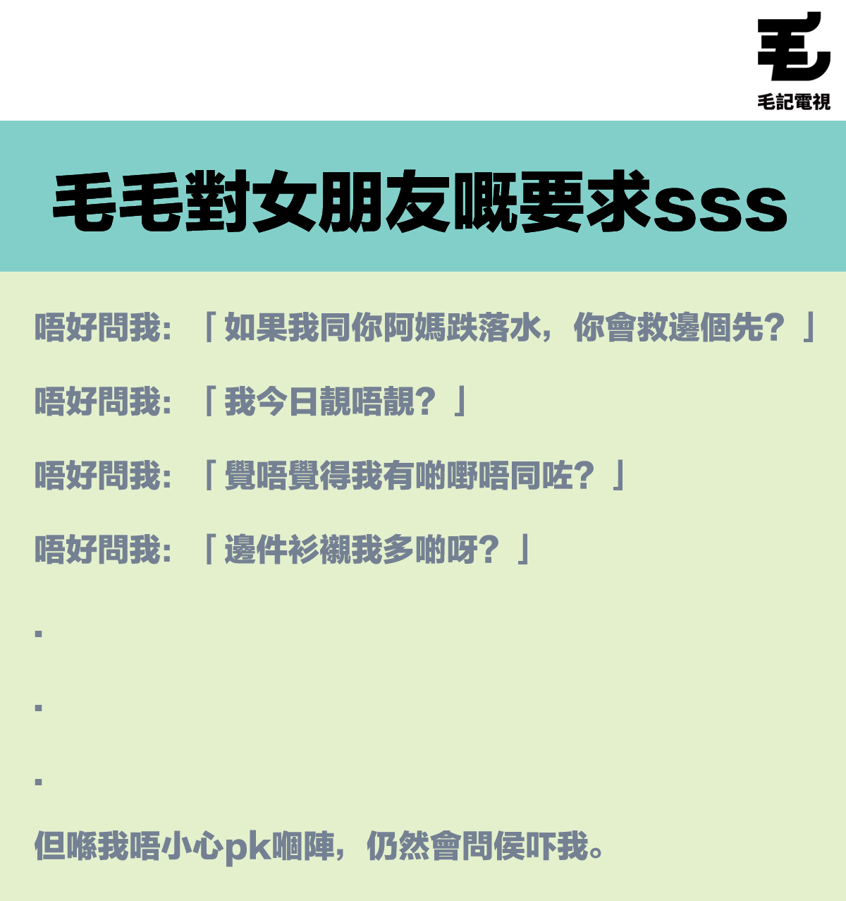 嗯,毛毛雖然未有女朋友,但都對將來嘅女朋友有少少要求嘅,少少啫,唔係好多,唔係好難。